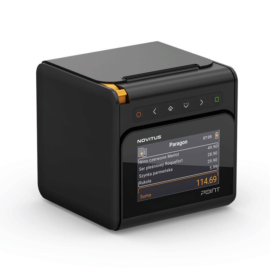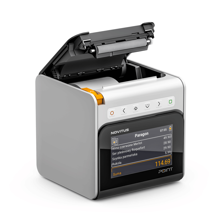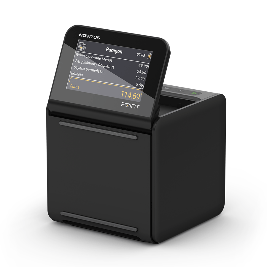 Drukarka Novitus POINT to najnowsza drukarka fiskalna marki Novitus dedykowana dla Twojego biznesu. Drukarka została wyposażona w szereg innowacyjnych funkcji oprogramowania oraz rozwiązań technologicznych. Oprócz wysokiej jakości mechanizmu drukującego zapewniającego bardzo szybki wydruk i precyzyjnego obcinacza papieru drukarka, wyposażona jest w kolorowy wyświetlacz prezentujący zawartość paragonu i nazwy sprzedawanych towarów lub (również graficzne) menu drukarki. Drukarka pracuje w dwóch pozycjach: podnoszonym wyświetlaczem skierowanym do góry i w stronę klienta, a mechanizmem drukującym wydającym papier w stronę obsługi, lub mechanizmem drukującym do góry, a wyświetlaczem klienta zwróconym do przodu. Każdy może dopasować położenie jej pracy do własnego stanowiska sprzedaży.